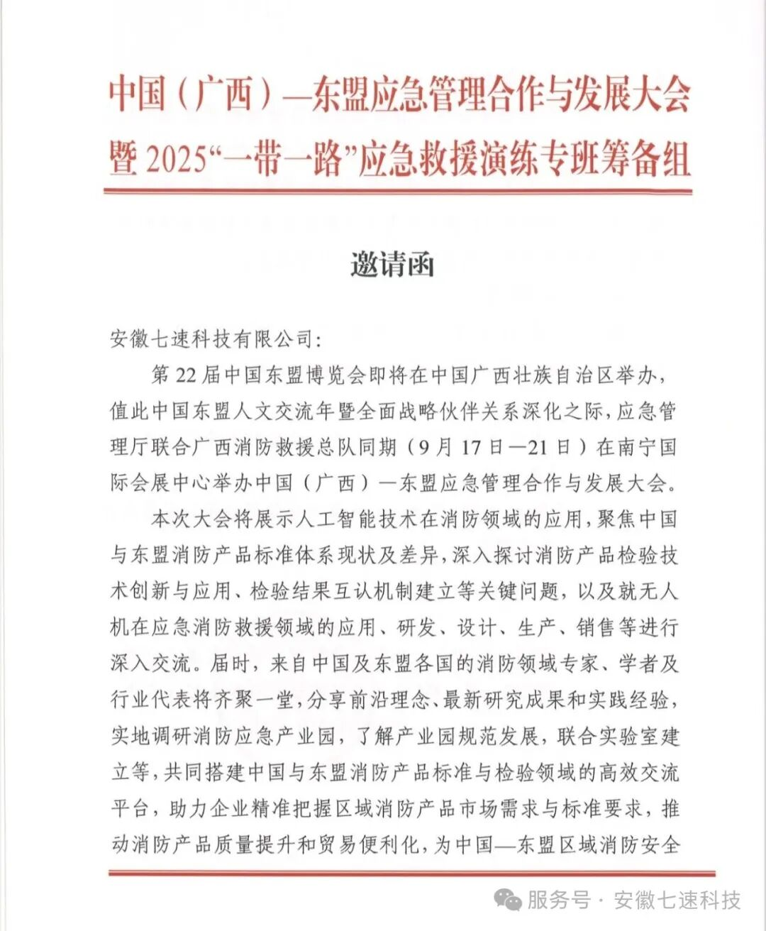 2025年9月17日至21日,2025年中国(广西)—东盟应急管理合作与发展大会暨“一带一路”应急救援演练在广西南宁隆重举行。作为国内消防救援人工智能领域的创新先锋,安徽七速科技有限公司受邀深度参与此次国际盛会,通过、技术展示及跨国协作研讨等形式,向中国与东盟国家应急管理部门、消防救援机构及行业专家全面呈现了AI技术驱动应急管理现代化的创新实践,更凭借 “零同卫士” 智慧安全用电系列产品的亮眼表现成为展会焦点,为中国与东盟国家应急管理合作注入数智新动能。